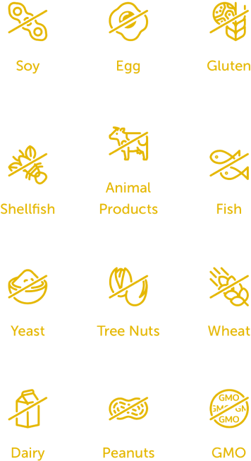 Wheat, gluten, yeast, soy, animal and dairy products, fish, shellfish, peanuts, tree nuts, egg, ingredients derived from genetically modified organisms (GMOs), artificial colors, artificial sweeteners, and artificial preservatives.